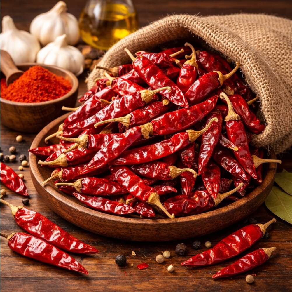 Premium whole red chillies with vibrant color and high pungency, carefully dried and processed, widely used in spice industries, ensures uniform size and quality, free from contaminants, packed hygienically, and supplied for international markets.